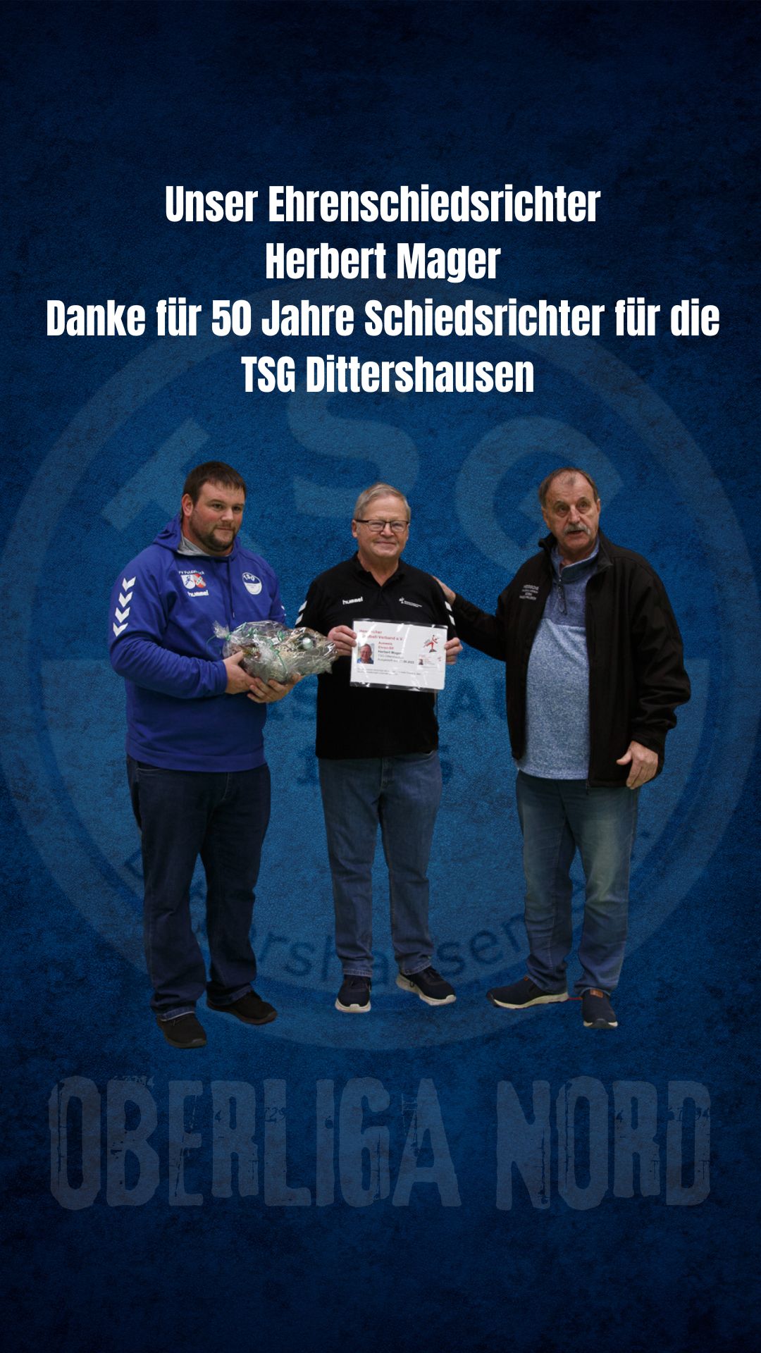 Über 50 Jahre lang war er als Handballschiedsrichter tätig. Immer für die TSG Dittershausen, für die er auch selbst lange spielte. Wie viele Partien Herbert Mager geleitet hat, kann er nur überschlagen. "1500 waren es mindestens, 2000 höchstens", sagt der 71-Jährige. Vom Bezirk-Kassel-Waldeck, vertreten durch Schiedsrichterwart Jürgen Schachtschneider, wurde er, vor der Oberligapartie des TSG Dittershausen gegen die HSG Baunatal, zum Ehrenschiedsrichter ernannt.